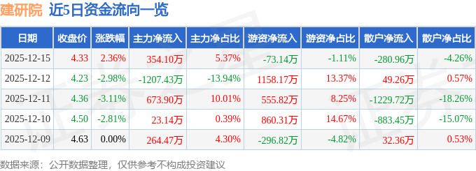 证券之星消息,截至2025年12月15日收盘,建研院(603183)报收于4.33元,上涨2.36%,换手率3.09%,成交量15.34万手,成交额6596.84万元。