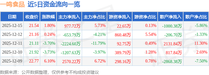 证券之星消息,截至2025年12月15日收盘,一鸣食品(605179)报收于21.54元,上涨1.8%,换手率1.97%,成交量7.92万手,成交额1.71亿元。