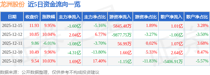 12月15日的资金流向数据方面,主力资金净流出1.6亿元,占总成交额5.16%,游资资金净流入5845.48万元,占总成交额1.89%,散户资金净流入1.01亿元,占总成交额3.28%。