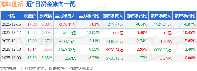 证券之星消息,截至2025年12月15日收盘,海峡创新(300300)报收于17.59元,上涨6.09%,换手率27.96%,成交量186.47万手,成交额31.49亿元。