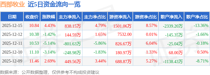 证券之星消息,截至2025年12月15日收盘,西部牧业(300106)报收于10.84元,上涨4.43%,换手率7.67%,成交量16.21万手,成交额1.75亿元。