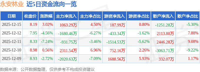 证券之星消息,截至2025年12月15日收盘,永安林业(000663)报收于8.19元,上涨3.02%,换手率9.43%,成交量28.88万手,成交额2.36亿元。