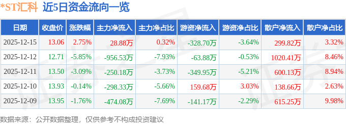 证券之星消息,截至2025年12月15日收盘,*ST汇科(300561)报收于13.06元,上涨2.75%,换手率2.85%,成交量6.88万手,成交额9029.02万元。