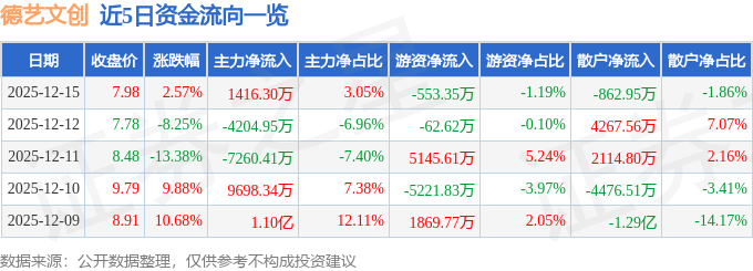 证券之星消息,截至2025年12月15日收盘,德艺文创(300640)报收于7.98元,上涨2.57%,换手率27.13%,成交量59.89万手,成交额4.65亿元。