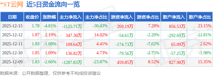 证券之星消息,截至2025年12月15日收盘,*ST云网(002306)报收于1.78元,下跌4.81%,换手率2.52%,成交量20.51万手,成交额3699.5万元。