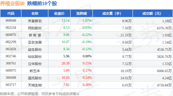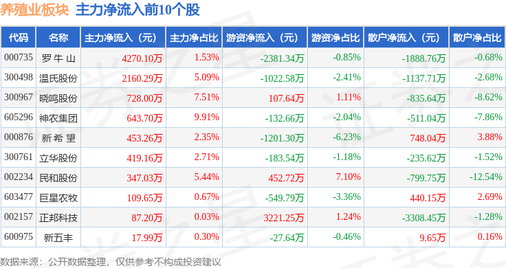从资金流向上来看,当日养殖业板块主力资金净流入1124.65万元,游资资金净流入248.51万元,散户资金净流出1373.16万元。养殖业板块个股资金流向见下表: