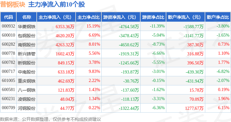 从资金流向上来看,当日普钢板块主力资金净流出1295.35万元,游资资金净流出1.32亿元,散户资金净流入1.45亿元。普钢板块个股资金流向见下表: