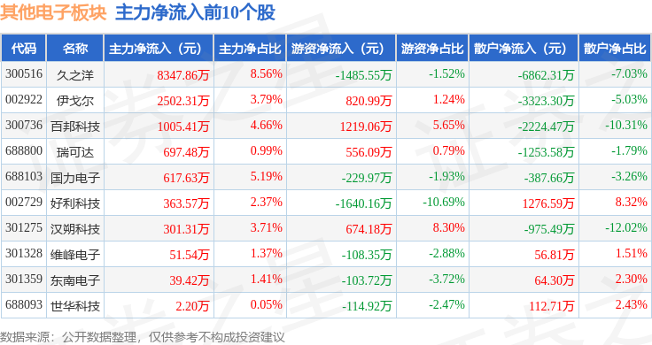 从资金流向上来看,当日其他电子板块主力资金净流出13.95亿元,游资资金净流入1.23亿元,散户资金净流入12.72亿元。其他电子板块个股资金流向见下表: