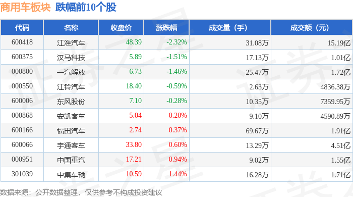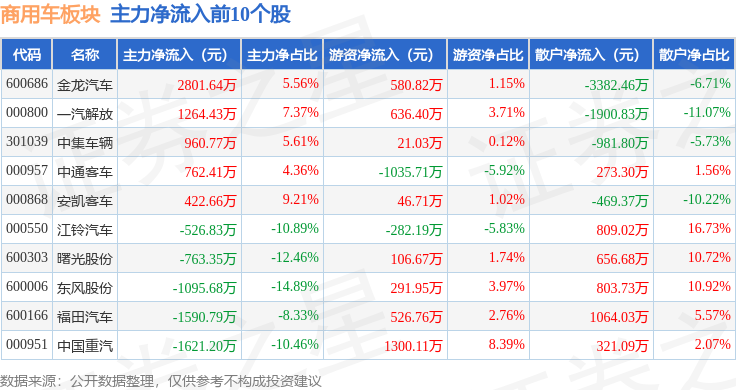 从资金流向上来看,当日商用车板块主力资金净流出1.54亿元,游资资金净流入1.6亿元,散户资金净流出586.91万元。商用车板块个股资金流向见下表: