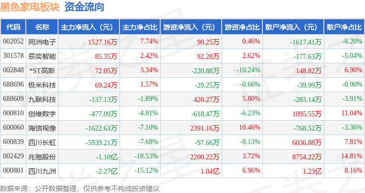 从资金流向上来看,当日黑色家电板块主力资金净流出4.01亿元,游资资金净流入1.47亿元,散户资金净流入2.54亿元。黑色家电板块个股资金流向见下表: