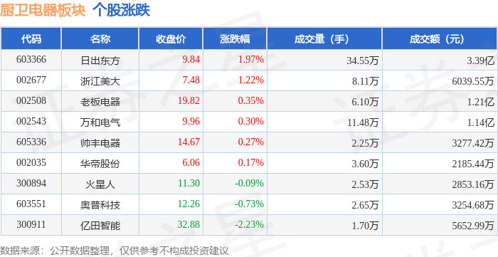 证券之星消息,12月15日厨卫电器板块较上一交易日上涨0.24%,日出东方领涨。当日上证指数报收于3867.92,下跌0.55%。深证成指报收于13112.09,下跌1.1%。厨卫电器板块个股涨跌见下表: