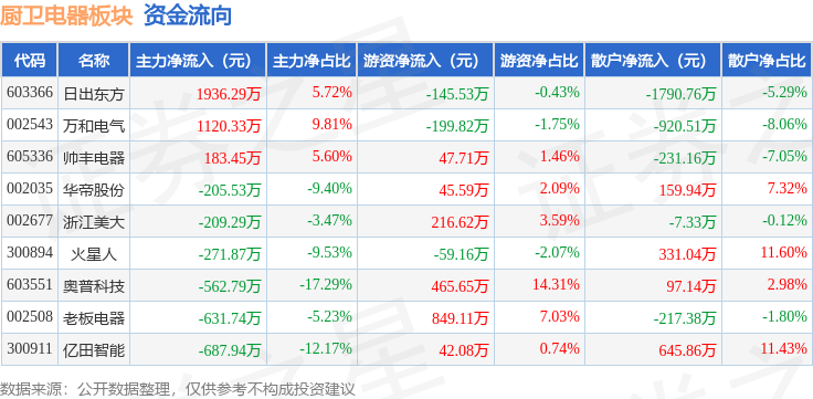 从资金流向上来看,当日厨卫电器板块主力资金净流入670.92万元,游资资金净流入1262.25万元,散户资金净流出1933.17万元。厨卫电器板块个股资金流向见下表: