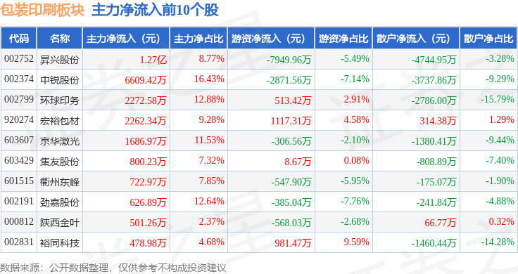 从资金流向上来看,当日包装印刷板块主力资金净流出5.35亿元,游资资金净流入5119.84万元,散户资金净流入4.84亿元。包装印刷板块个股资金流向见下表:
