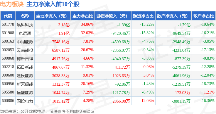 从资金流向上来看,当日电力板块主力资金净流出6.6亿元,游资资金净流入1.84亿元,散户资金净流入4.76亿元。电力板块个股资金流向见下表: