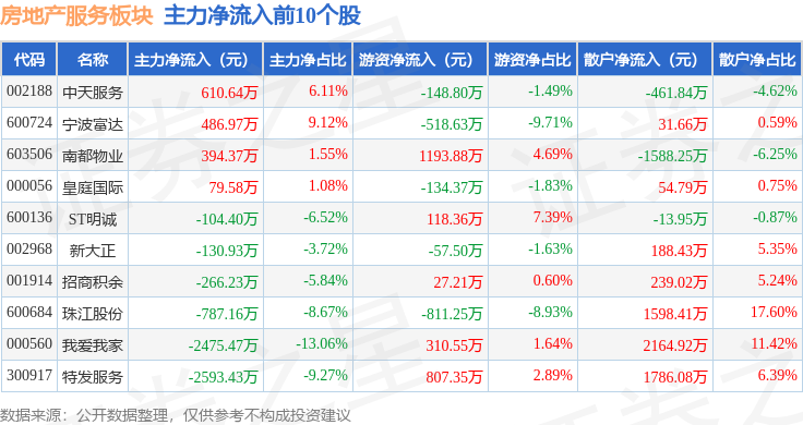 从资金流向上来看,当日房地产服务板块主力资金净流出8587.77万元,游资资金净流出91.52万元,散户资金净流入8679.28万元。房地产服务板块个股资金流向见下表: