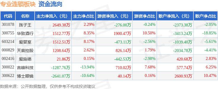 从资金流向上来看,当日专业连锁板块主力资金净流入2976.33万元,游资资金净流入2285.12万元,散户资金净流出5261.45万元。专业连锁板块个股资金流向见下表: