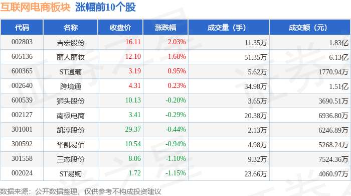 从资金流向上来看,当日互联网电商板块主力资金净流出1.12亿元,游资资金净流入4716.44万元,散户资金净流入6504.86万元。互联网电商板块个股资金流向见下表: