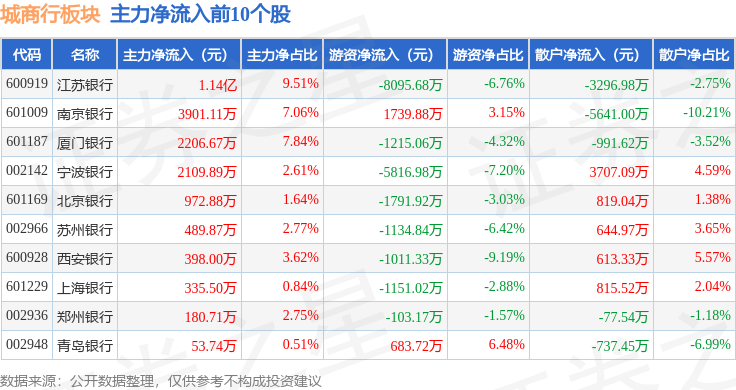 从资金流向上来看,当日城商行板块主力资金净流入1.49亿元,游资资金净流出1.59亿元,散户资金净流入994.98万元。城商行板块个股资金流向见下表: