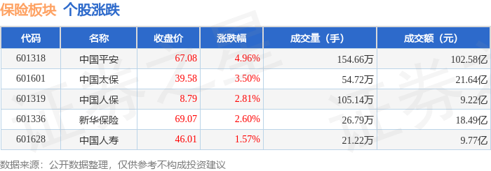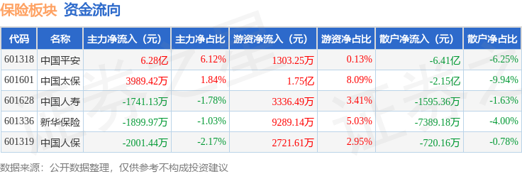 从资金流向上来看,当日保险板块主力资金净流入6.11亿元,游资资金净流入3.42亿元,散户资金净流出9.53亿元。保险板块个股资金流向见下表: