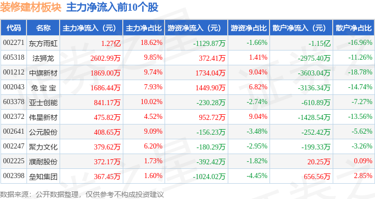 从资金流向上来看,当日装修建材板块主力资金净流入8184.27万元,游资资金净流入5672.98万元,散户资金净流出1.39亿元。装修建材板块个股资金流向见下表: