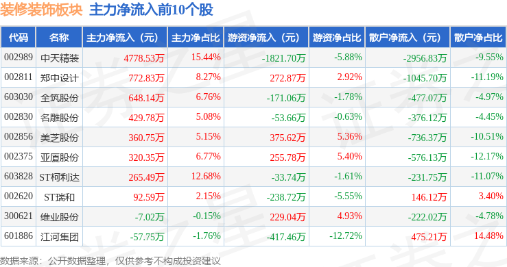 从资金流向上来看,当日装修装饰板块主力资金净流出1.16亿元,游资资金净流入5117.83万元,散户资金净流入6520.53万元。装修装饰板块个股资金流向见下表: