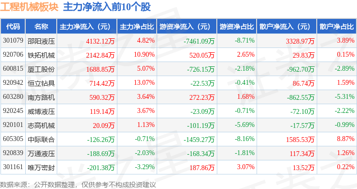 从资金流向上来看,当日工程机械板块主力资金净流出4.63亿元,游资资金净流入8453.94万元,散户资金净流入3.79亿元。工程机械板块个股资金流向见下表: