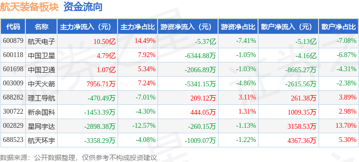 从资金流向上来看,当日航天装备板块主力资金净流入16.34亿元,游资资金净流出6.8亿元,散户资金净流出9.54亿元。航天装备板块个股资金流向见下表: