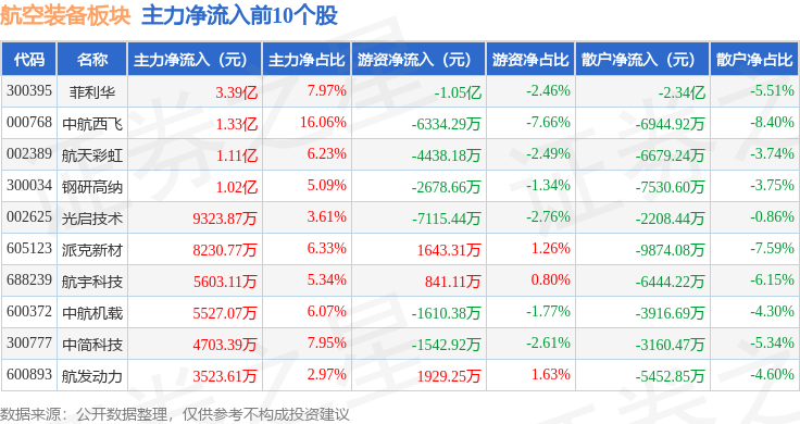 从资金流向上来看,当日航空装备板块主力资金净流入6.81亿元,游资资金净流出2.72亿元,散户资金净流出4.09亿元。航空装备板块个股资金流向见下表: