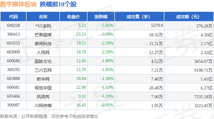 证券之星消息,12月15日数字媒体板块较上一交易日下跌1.97%,*ST返利领跌。当日上证指数报收于3867.92,下跌0.55%。深证成指报收于13112.09,下跌1.1%。数字媒体板块个股涨跌见下表: