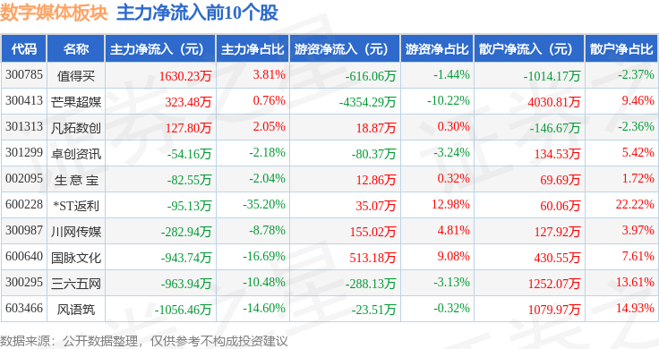 从资金流向上来看,当日数字媒体板块主力资金净流出1.58亿元,游资资金净流出5576.92万元,散户资金净流入2.14亿元。数字媒体板块个股资金流向见下表: