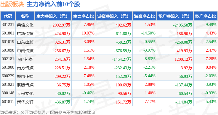 从资金流向上来看,当日出版板块主力资金净流出2.15亿元,游资资金净流入2868.24万元,散户资金净流入1.87亿元。出版板块个股资金流向见下表: