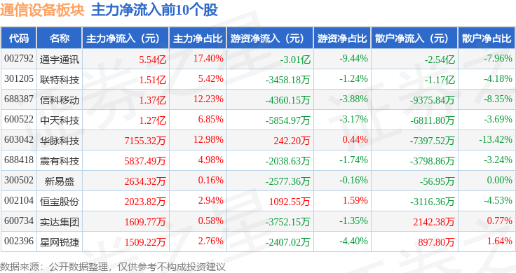 从资金流向上来看,当日通信设备板块主力资金净流出51.76亿元,游资资金净流入9.69亿元,散户资金净流入42.06亿元。通信设备板块个股资金流向见下表: