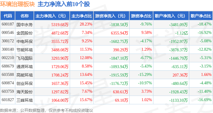 从资金流向上来看,当日环境治理板块主力资金净流出2.75亿元,游资资金净流入7327.06万元,散户资金净流入2.01亿元。环境治理板块个股资金流向见下表:
