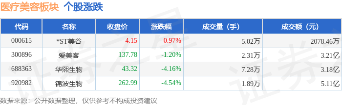 证券之星消息,12月15日医疗美容板块较上一交易日下跌2.27%,锦波生物领跌。当日上证指数报收于3867.92,下跌0.55%。深证成指报收于13112.09,下跌1.1%。医疗美容板块个股涨跌见下表: