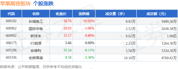 证券之星消息,12月15日苹果期货板块较上一交易日上涨0.97%,长城电工领涨。当日上证指数报收于3867.92,下跌0.55%。深证成指报收于13112.09,下跌1.1%。苹果期货板块个股涨跌见下表: