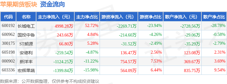 从资金流向上来看,当日苹果期货板块主力资金净流入2525.11万元,游资资金净流出1060.69万元,散户资金净流出1464.41万元。苹果期货板块个股资金流向见下表: