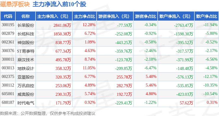 从资金流向上来看,当日磁悬浮板块主力资金净流出17.02亿元,游资资金净流入6.37亿元,散户资金净流入10.65亿元。磁悬浮板块个股资金流向见下表: