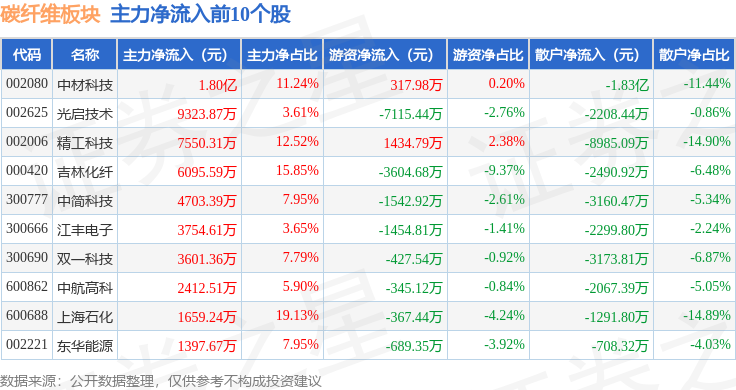 从资金流向上来看,当日碳纤维板块主力资金净流入2.47亿元,游资资金净流出1.63亿元,散户资金净流出8451.73万元。碳纤维板块个股资金流向见下表: