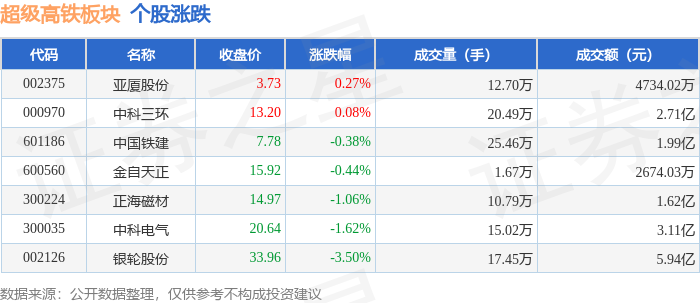 证券之星消息,12月15日超级高铁板块较上一交易日下跌0.98%,银轮股份领跌。当日上证指数报收于3867.92,下跌0.55%。深证成指报收于13112.09,下跌1.1%。超级高铁板块个股涨跌见下表: