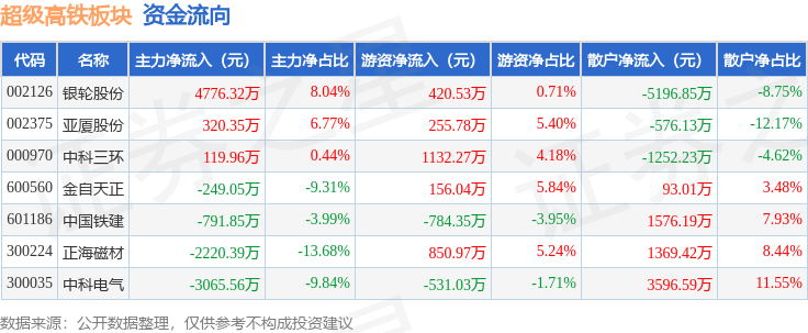 从资金流向上来看,当日超级高铁板块主力资金净流出1110.21万元,游资资金净流入1500.21万元,散户资金净流出390.0万元。超级高铁板块个股资金流向见下表:
