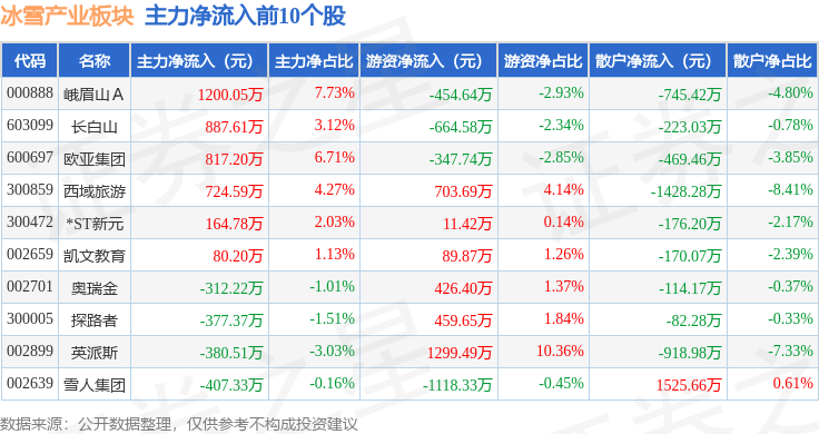 从资金流向上来看,当日冰雪产业板块主力资金净流出2.62亿元,游资资金净流出1247.29万元,散户资金净流入2.74亿元。冰雪产业板块个股资金流向见下表: