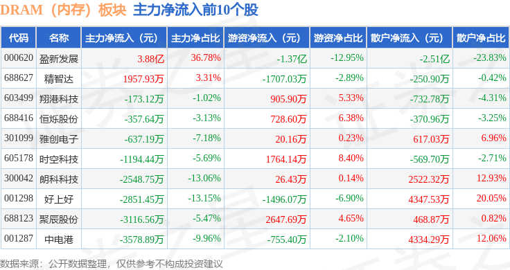 从资金流向上来看,当日DRAM(内存)板块主力资金净流出33.09亿元,游资资金净流入8.4亿元,散户资金净流入24.68亿元。DRAM(内存)板块个股资金流向见下表: