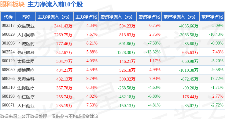 从资金流向上来看,当日眼科板块主力资金净流出5.95亿元,游资资金净流入1.62亿元,散户资金净流入4.34亿元。眼科板块个股资金流向见下表: