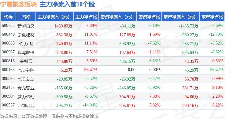 从资金流向上来看,当日宁夏概念板块主力资金净流出1.06亿元,游资资金净流入2704.48万元,散户资金净流入7944.95万元。宁夏概念板块个股资金流向见下表: