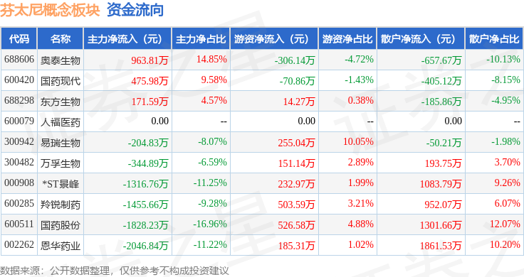 从资金流向上来看,当日芬太尼概念板块主力资金净流出5585.83万元,游资资金净流入1491.89万元,散户资金净流入4093.94万元。芬太尼概念板块个股资金流向见下表: