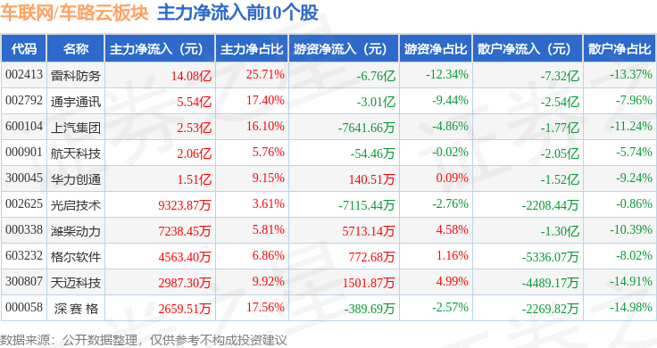 从资金流向上来看,当日车联网/车路云板块主力资金净流出17.08亿元,游资资金净流出3.75亿元,散户资金净流入20.83亿元。车联网/车路云板块个股资金流向见下表: