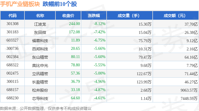 证券之星消息,12月15日手机产业链板块较上一交易日下跌2.51%,江波龙领跌。当日上证指数报收于3867.92,下跌0.55%。深证成指报收于13112.09,下跌1.1%。手机产业链板块个股涨跌见下表: