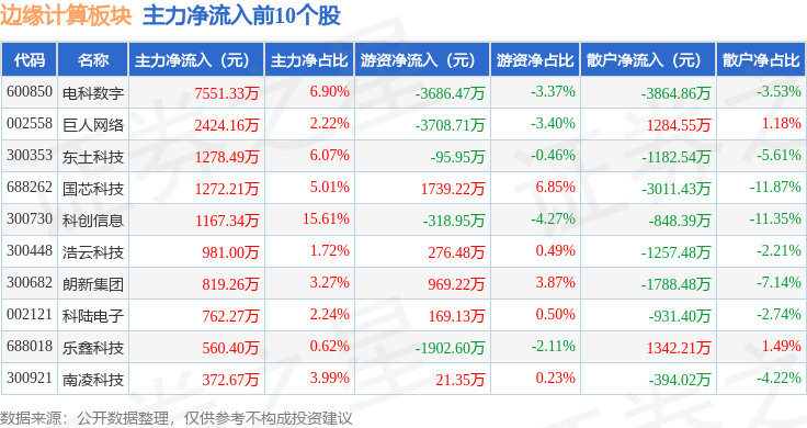 从资金流向上来看,当日边缘计算板块主力资金净流出24.56亿元,游资资金净流入3.46亿元,散户资金净流入21.1亿元。边缘计算板块个股资金流向见下表:
