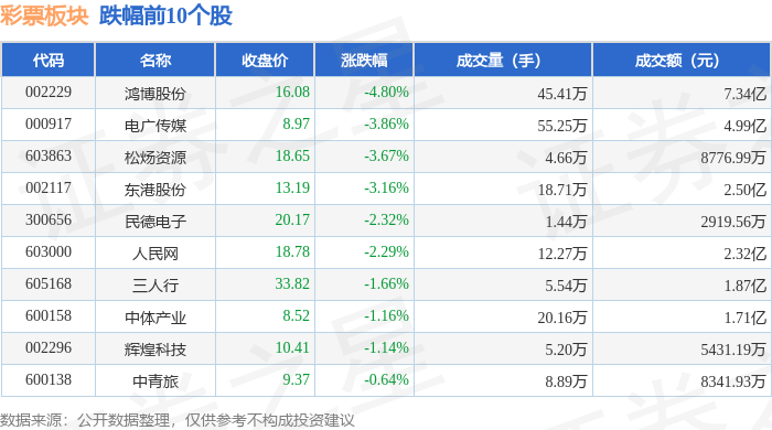 证券之星消息,12月15日彩票板块较上一交易日下跌1.21%,鸿博股份领跌。当日上证指数报收于3867.92,下跌0.55%。深证成指报收于13112.09,下跌1.1%。彩票板块个股涨跌见下表: