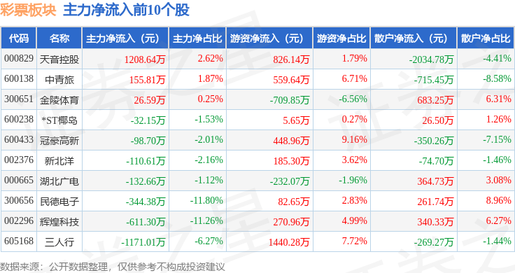 从资金流向上来看,当日彩票板块主力资金净流出3.07亿元,游资资金净流出31.15万元,散户资金净流入3.07亿元。彩票板块个股资金流向见下表: